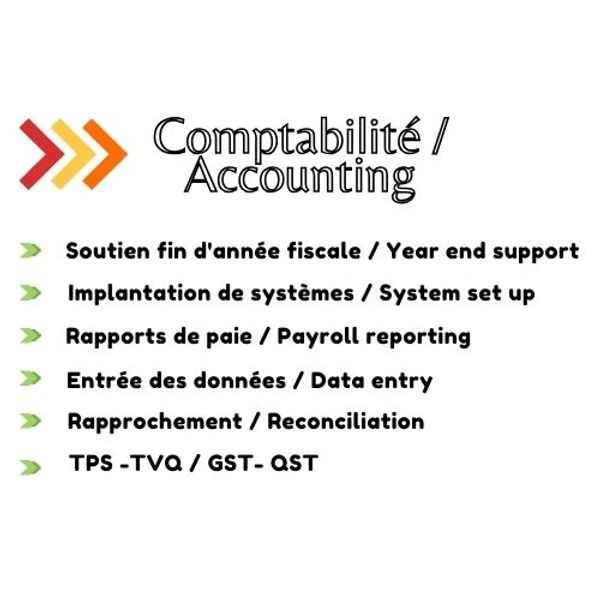 Nos services de gestion de la comptabilité sont disponibles pour le public 12 mois par année pour vous aider avec votre comptabilité , vos rapprochements, vos rapports gouvernementaux, la mise en place de systèmes, et vous offre du soutien dans la restructuration, la révision ou l’audit de votre organisme sans but lucratif, de votre petite entreprise ou de vous-même
